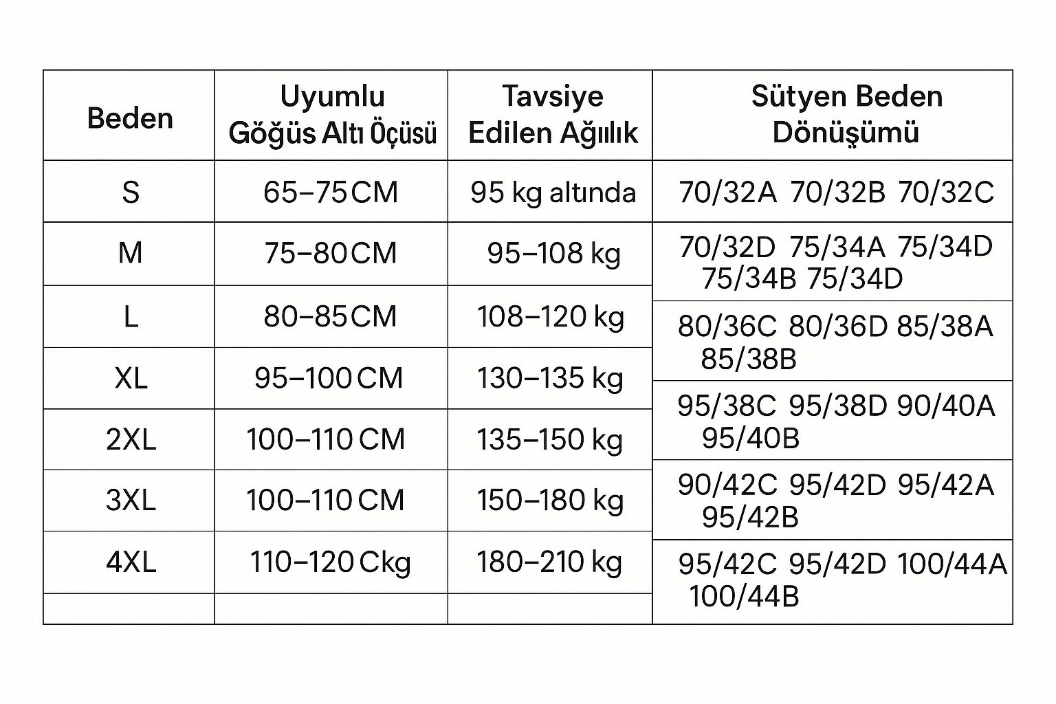 Sütyen esnek bir yapıya sahip olsa da, en iyi kavrama ve destek için göğüs çevresi ölçünü dikkate alman önerilir. Beden tablosunu inceleyerek hem rahat hem de destekleyici bir form yakalayabilirsin.